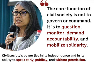 CSOs များ၏ အဓိကအခန်းကဏ္ဍမှာ အုပ်ချုပ်ရန် သို့မဟုတ် အမိန့်ပေးရန် မဟုတ်ပါ။ မေးခွန်းထုတ်ရန်၊ စောင့်ကြည့်ရန်၊ တာဝန်ယူမှု၊ တာဝန်ခံမှု တောင်းဆိုရန်နှင့်…